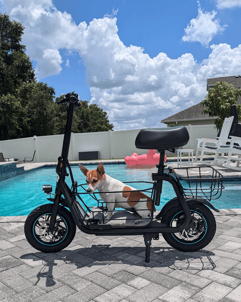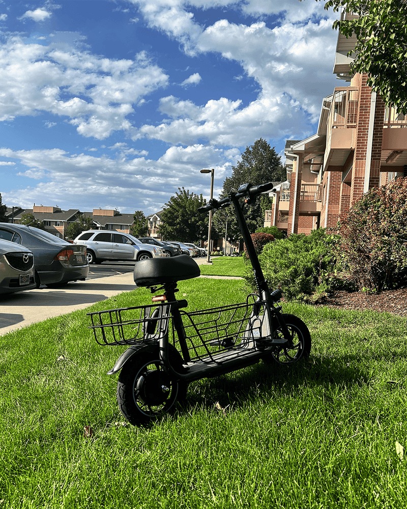 - SPACIOUS STORAGE: Featuring a large detachable middle basket and a small rear basket, this electric scooter with seat offers ample storage space, making transportation of bulky items a breeze. Wide Deck: The 9.5" wide deck offers plenty of room for your feet or even a small pet. Shock-Absorbing Tires: Equipped with thick and sturdy 12" tires that absorb most shocks, providing a smooth and comfortable riding experience.