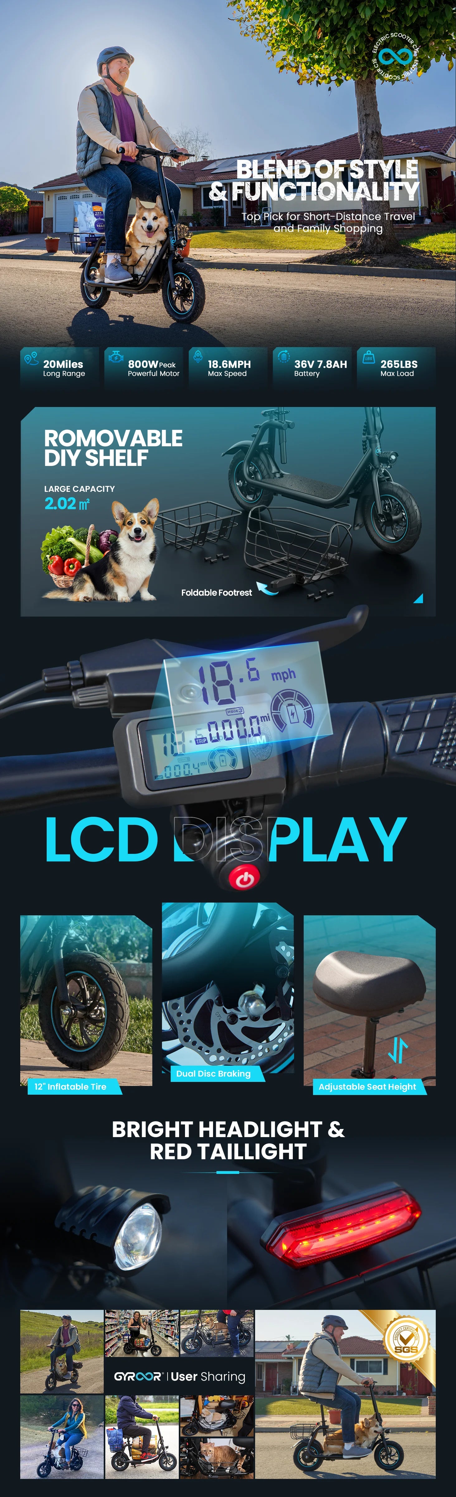 • SPACIOUS STORAGE: Featuring a large detachable middle basket and a small rear basket, this electric scooter with seat offers ample storage space, making transportation of bulky items a breeze. Wide Deck: The 9.5" wide deck offers plenty of room for your feet or even a small pet. Shock-Absorbing Tires: Equipped with thick and sturdy 12" tires that absorb most shocks, providing a smooth and comfortable riding experience.