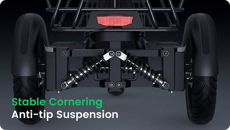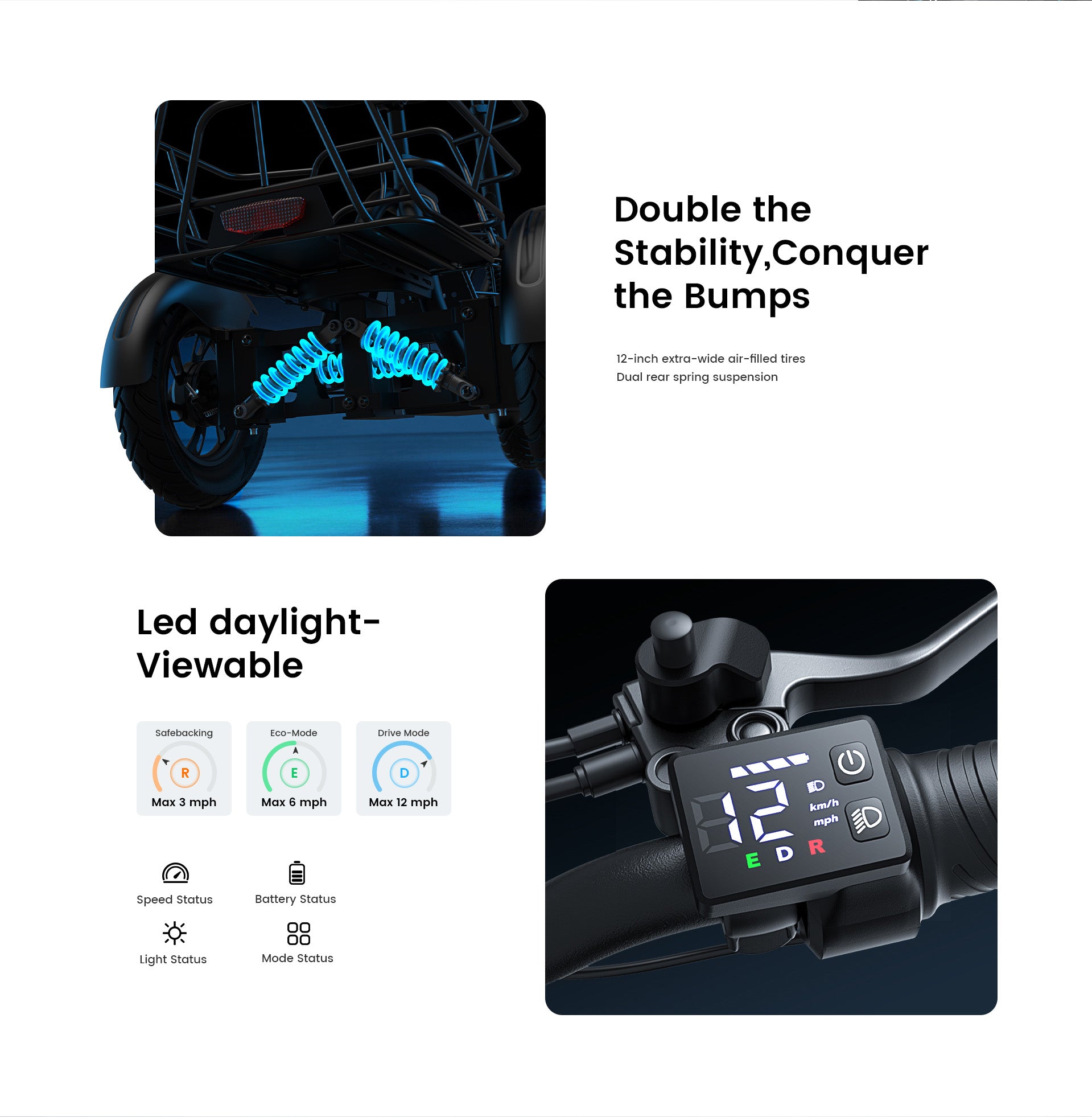 - Ultra-Smooth Ride with Dual Suspension: Rear shock absorbers and a thick padded seat minimize bumps on rough roads, while the 12-inch air-filled tires enhance grip on pavement, gravel, or light trails. Ride comfortably for hours!