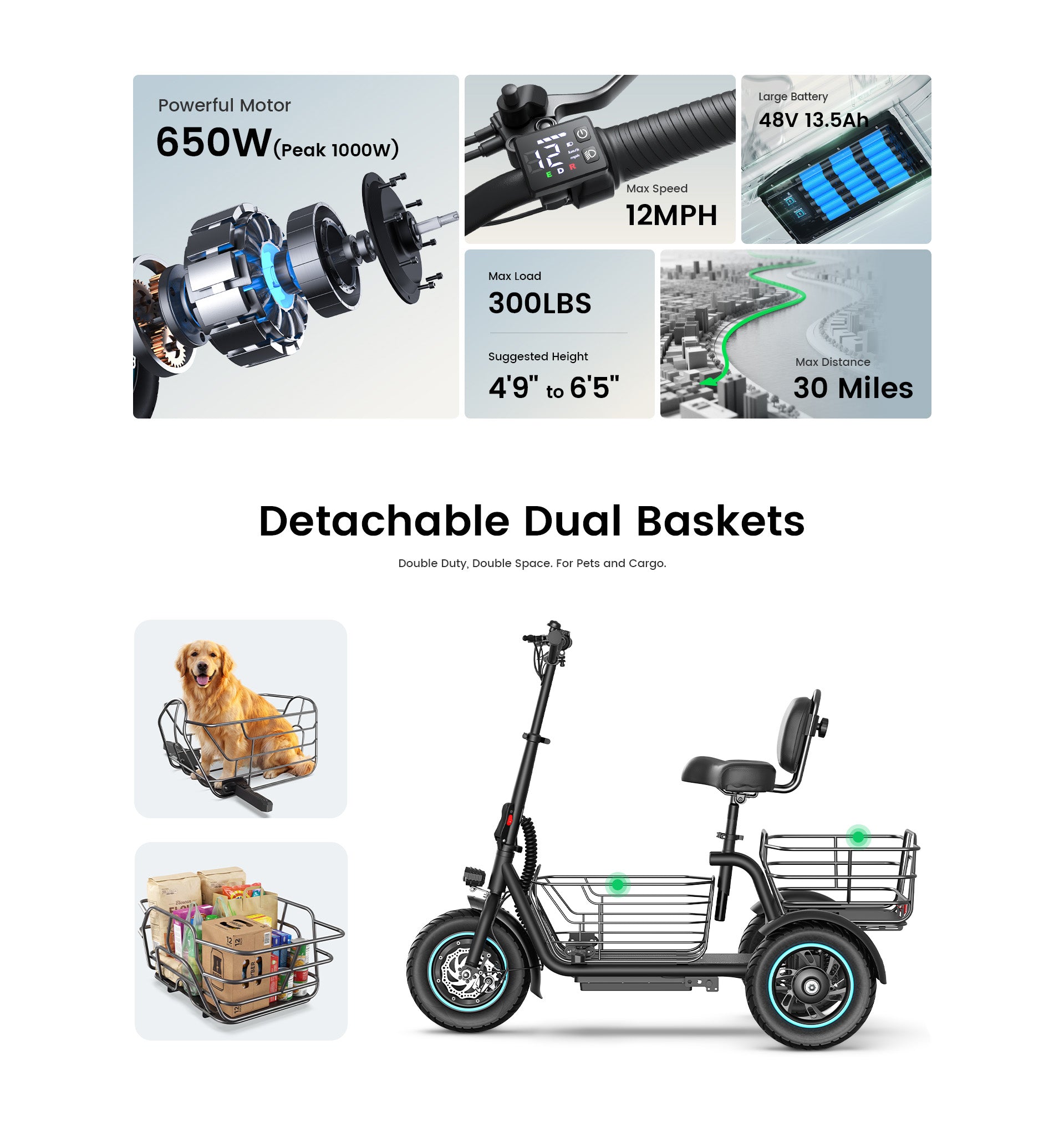 Gyroor C5 Electric Trike with Removable Dual Baskets,1000W(Peak) & 30Miles