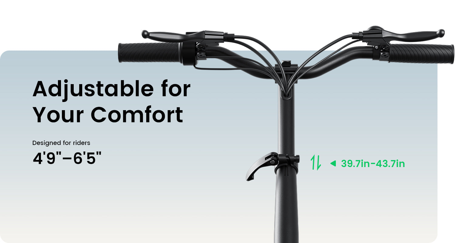- Smart Adjustable Design & LCD Dashboard: Customizable fit: Adjustable seat and handlebar height suit riders from 5’2" to 6’5". LCD display shows speed, battery level, mileage, and headlight status—even in sunlight.