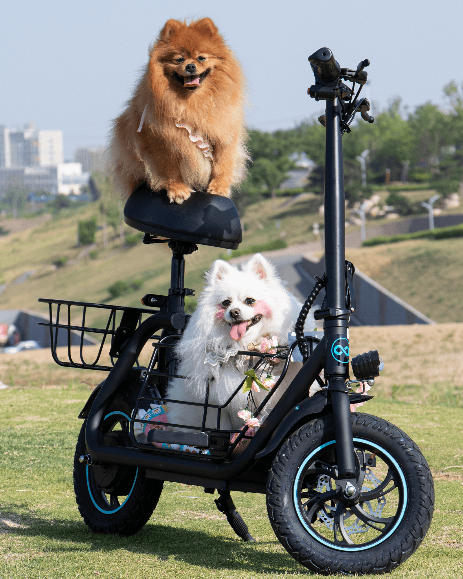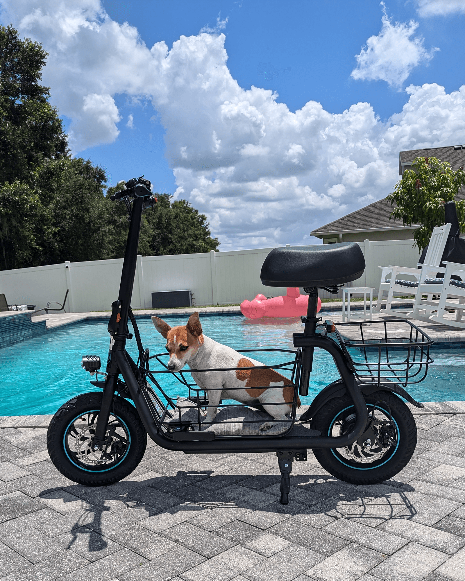 • SPACIOUS STORAGE: Featuring a large detachable middle basket and a small rear basket, this electric scooter with seat offers ample storage space, making transportation of bulky items a breeze. Wide Deck: The 9.5" wide deck offers plenty of room for your feet or even a small pet. Shock-Absorbing Tires: Equipped with thick and sturdy 12" tires that absorb most shocks, providing a smooth and comfortable riding experience.